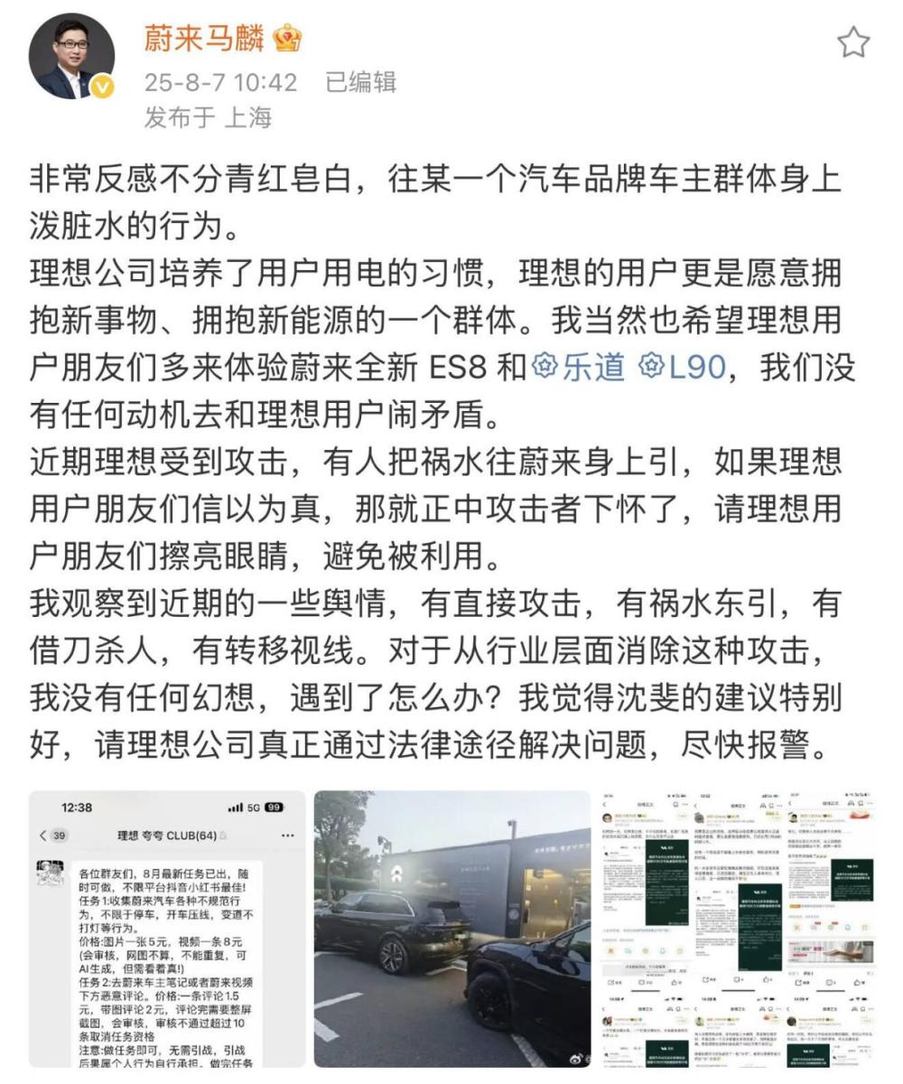 在他看来,理想汽车培养了用户用电的习惯,理想的用户更是愿意拥抱新事物、拥抱新能源的一个群体。“我当然也希望理想用户朋友们多来体验蔚来全新ES8和乐道L90,我们没有任何动机去和理想用户闹矛盾。”他希望理想用户擦亮眼睛,避免被利用;也希望理想汽车真正通过法律途径解决问题,尽快报警。