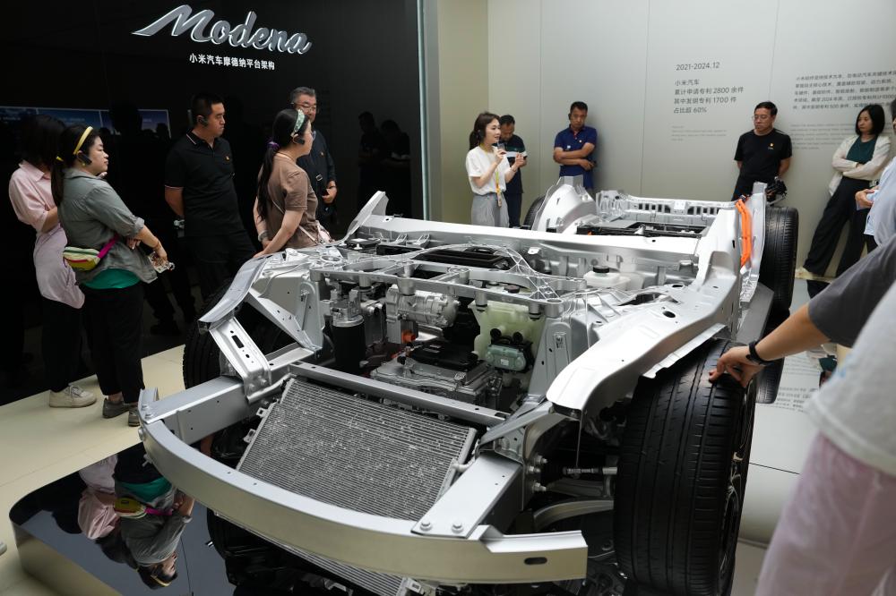2025年6月16日,参观者在北京小米汽车工厂的科技展厅了解小米汽车摩德纳平台架构。