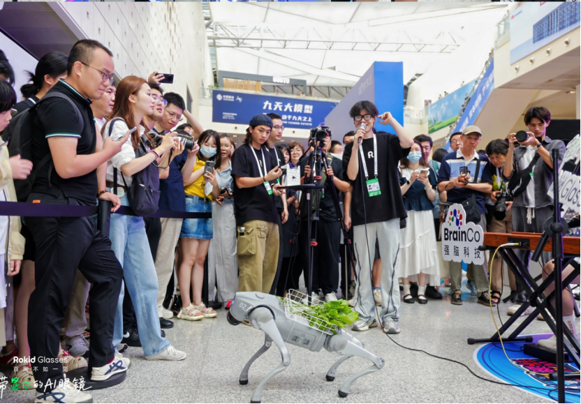 在WAIC的科技音乐会上,歌手佩戴Rokid Glasses通过提词功能实时查看歌词,体验官周键用意识直接控制强脑科技智能仿生手弹奏电子琴,旁边更有宇树机器人、机器狗伴舞。