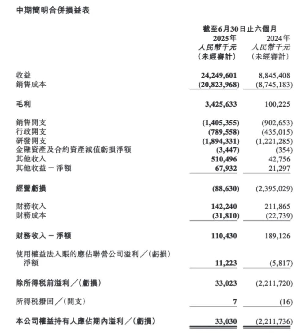 零跑汽车2025年上半年基本财务数据(图/财报截图)