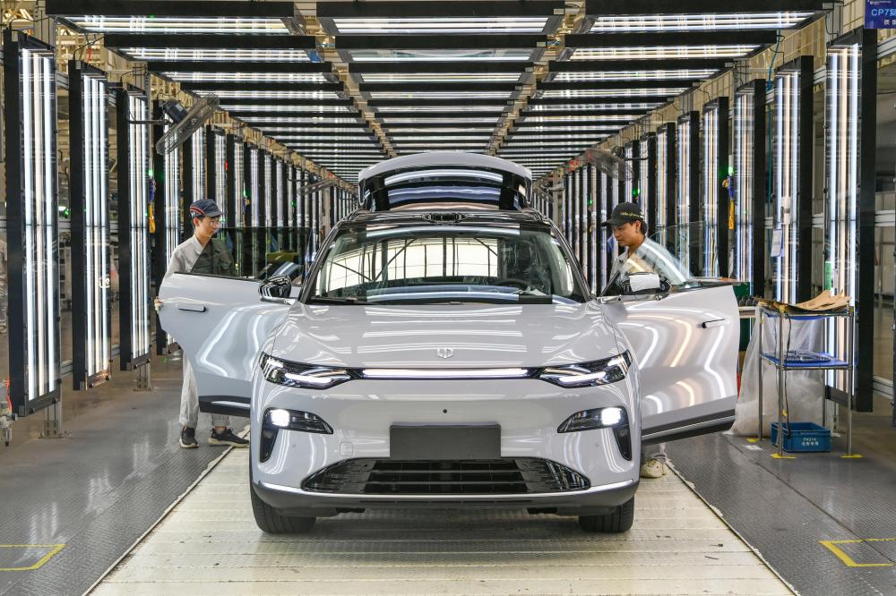 2025年7月16日,浙江金华,新能源汽车小镇零跑汽车智能工厂车间,工人们在生产线上有序装配汽车。