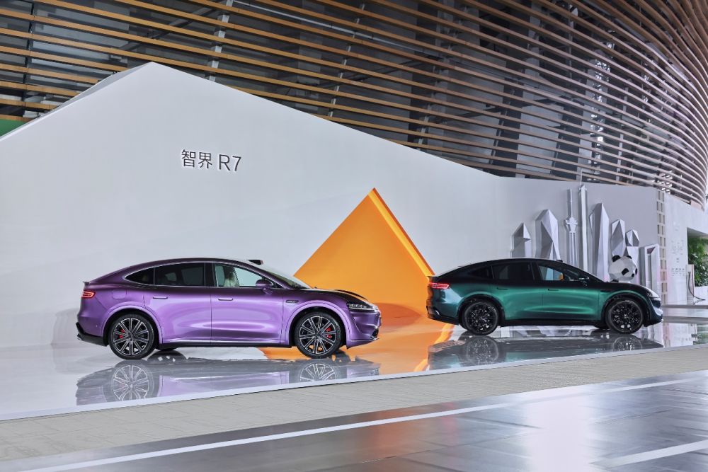 两款车型首次配置升级后的智界图形车标,新增极光绿车漆与罗兰紫内饰。新款智界R7更通过加宽前脸侧进气口、提拉尾部线条等细节,强化车身运动姿态,进一步提升车辆“得房率”。