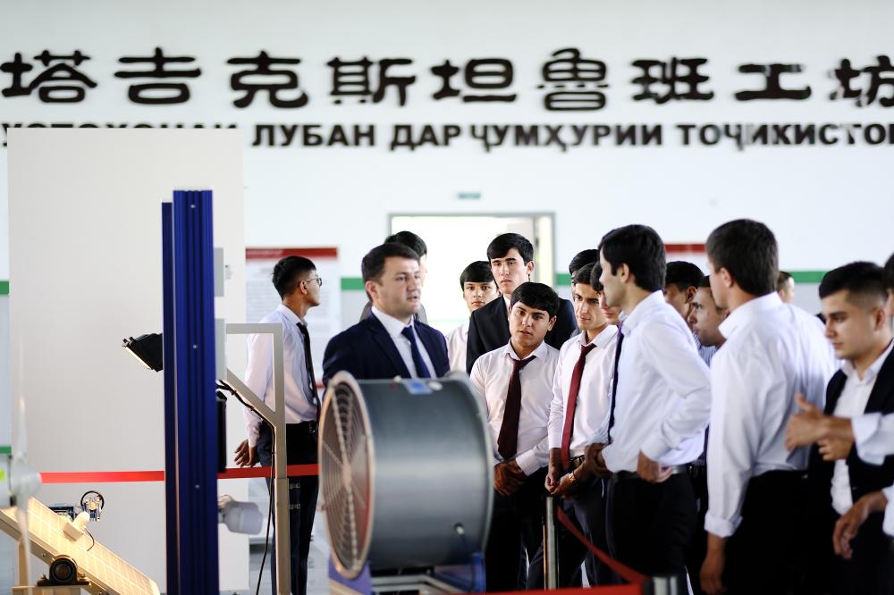 2024年6月14日,学生们在塔吉克斯坦首都杜尚别的鲁班工坊内听老师讲解。