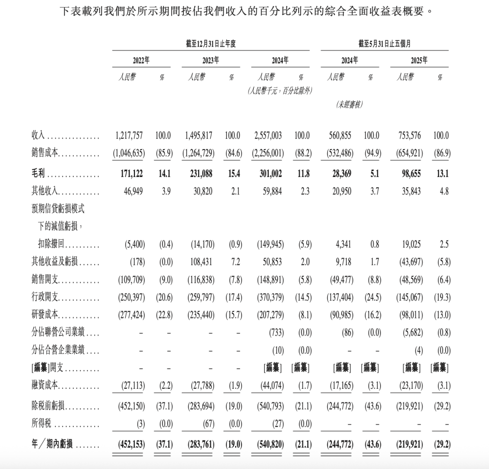 尽管其不断提升研发和运营效率,但目前公司收入暂无法完全覆盖成本,对应周期内的毛利率分别为14.1%、15.4%、11.8%及13.1%,净亏损分别为4.52亿、2.84亿、5.41亿及2.20亿元,三年五个月内的累计经调整净亏损额约为11.26亿元。
