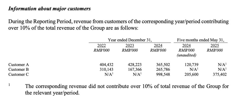 2022-2024年,来自前五大客户的合计收入分别占该公司总收入的83.6%、64.6%以及74.4%;其中,来自最大客户的收入占比分别达到33.2%、28.6%、39.1%,这一比例在2025年前5个月进一步提升至49.8%。