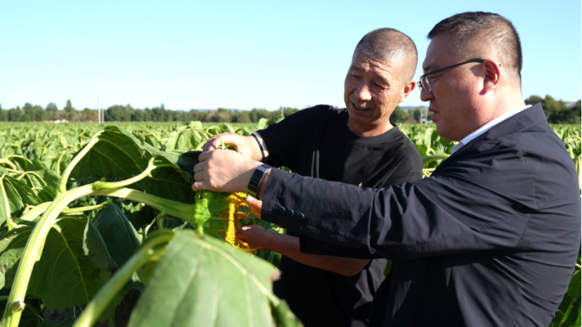 农行辽宁朝阳建平支行工作人员与杂粮大户付汉兵共同察看庄稼收成