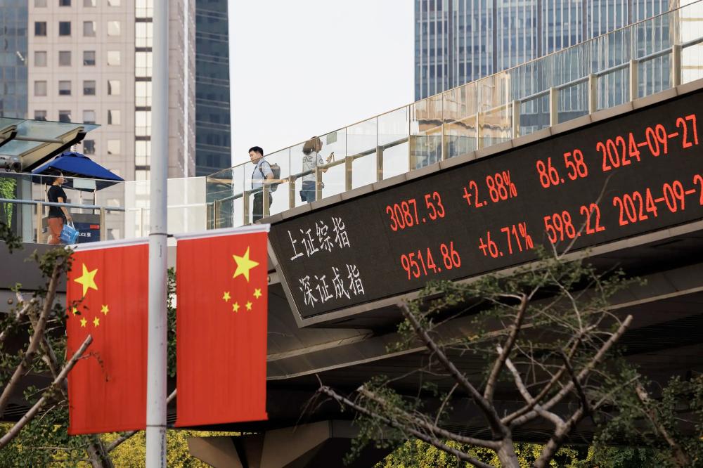 2024年9月27日,上海一座人行天桥下,屏幕上显示当日沪市和深市股票指数。