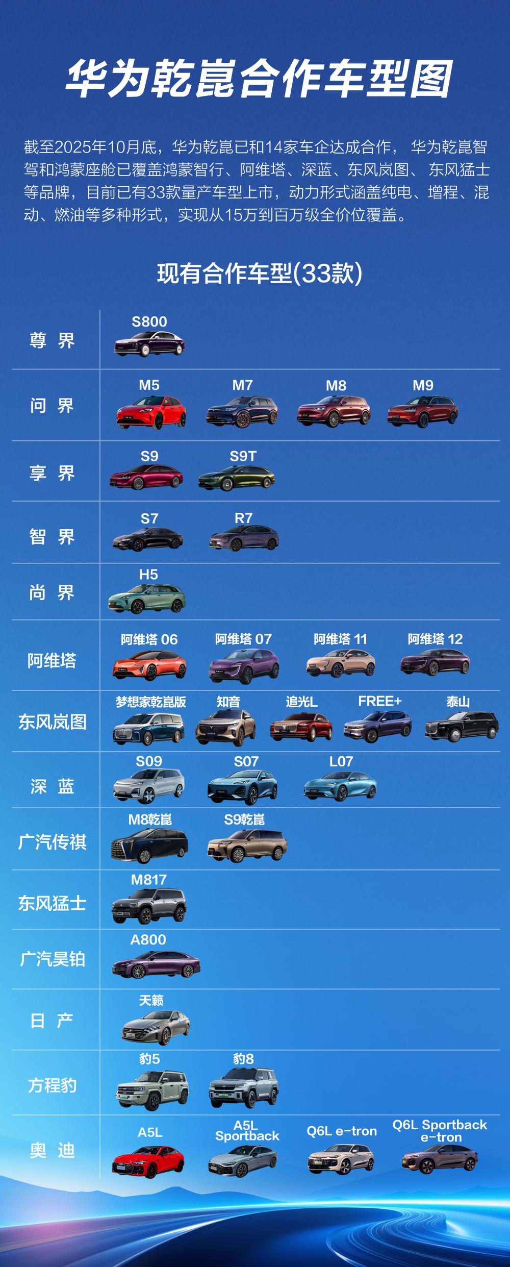目前已有14家车企的33款量产车型搭载华为乾崑智驾或鸿蒙座舱解决方案,单月最高销量超10万台,智驾总用户数突破100万。