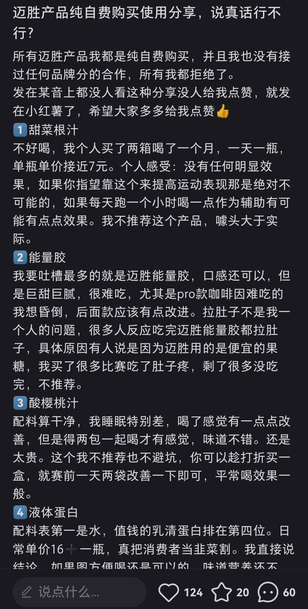 社交平台上,也有部分消费者吐槽迈胜甜菜根液效果不明显,噱头大于实际;能量胶口感还行,但味道太甜;酸樱桃液味道不错,但只有赛前一天两袋可改善睡眠情况,平时喝效果一般......