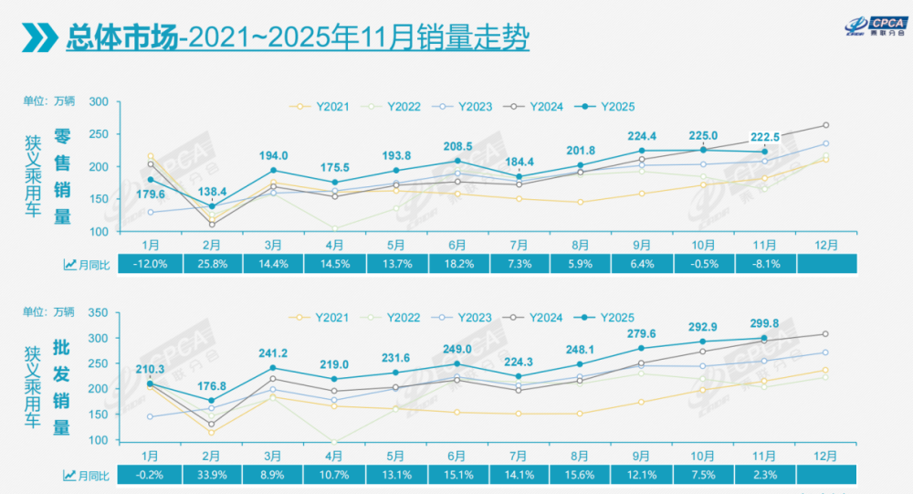 12月8日,中国汽车流通协会乘用车市场信息联席分会(简称“乘联分会)发布数据,2025年11月,全国狭义乘用车(含轿车、SUV、MPV车型)零售销量约为222.5万辆,同比下滑8.1%,环比少见下滑1.1%,这也是2023年以来车市零售销量首次出现同比负增长。前11个月,全国狭义乘用车累计零售销量达到约2148.3万辆,同比增长6.1%。