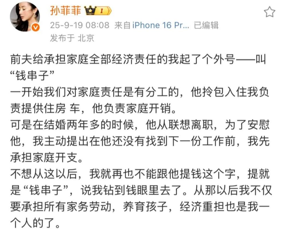 孙菲菲在微博讲述婚内生活细节,自己长期承担家务劳动和家庭开销。