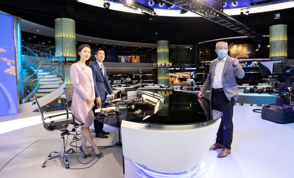 2022年1月初,疫情期间,凤凰卫视刚刚完成改版。孙玉胜(右)在全新设计的凤凰卫视香港总部主演播台,与《凤凰午间专列》主持人(左起:黄橙子、王峰)探讨播出细节。