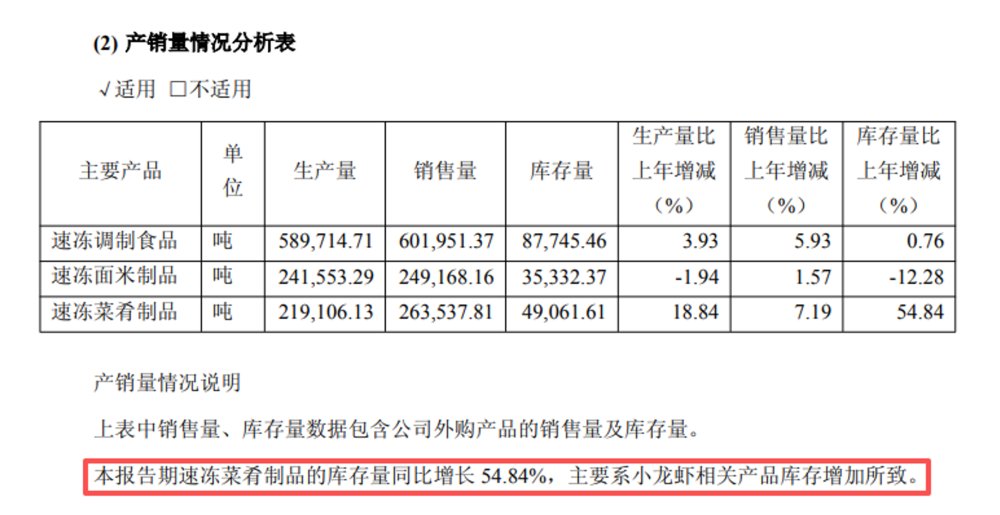 同时,速冻菜肴制品库存量同比增加 54.85%,公司在年报中明确,库存增长主要系小龙虾相关产品备货增加所致。