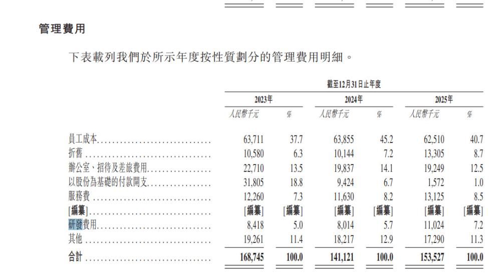 但作为更名为“营养科技”的企业,宜品的研发投入占比却连续三年不足 0.6%。招股书中,宜品营养科技将研发费用归到行政开支大类下面,2023年到2025年,研发费用分别为841.8万元、801.4万元、1102.4万元,在营收中的占比分别为0.52%、0.45%、0.59%。