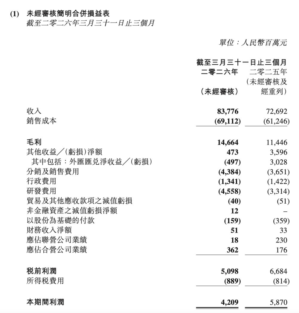 吉利汽车2026年第一季度基本财务表现(图/财报截图)