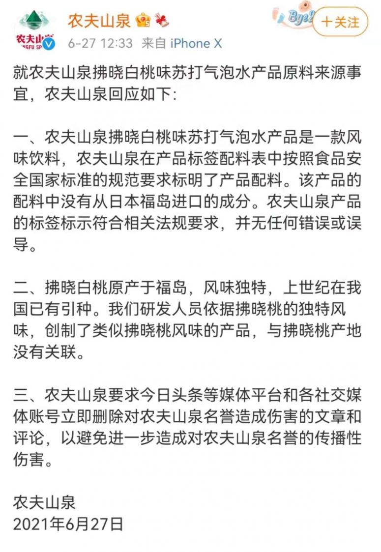 此事一经发酵,在网络上迅速引发巨大风波。6月27日中午,农夫山泉官方微博回应解释称,农夫山泉拂晓白桃味苏打气泡水产品是一款风味饮料,农夫山泉在产品标签配料表中按照食品安全国家标准的规范要求标明了产品配料。该产品的配料中没有从日本福岛进口的成分。农夫山泉产品的标签标示符合相关法规要求,并无任何错误或误导。