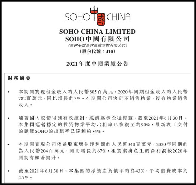 截至2021年上半年,SOHO中国投资物业平均出租率已恢复至约90%,去年同期出租率约为78%。而在2018年,SOHO中国投资物业平均出租率达96%。