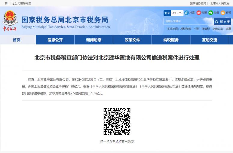 国家税务总局北京市税务局网站消息,经查,北京建华置地有限公司,在SOHO尚都项目(二、三期)土地增值税清算和企业所得税汇算清缴中,违规多扣成本,进行虚假申报,少缴土地增值税和企业所得税1.98亿元。根据《中华人民共和国税收征收管理法》《中华人民共和国行政处罚法》等法律法规规定,税务部门依法追缴税款、加收滞纳金并处2.5倍罚款共计7.09亿元。