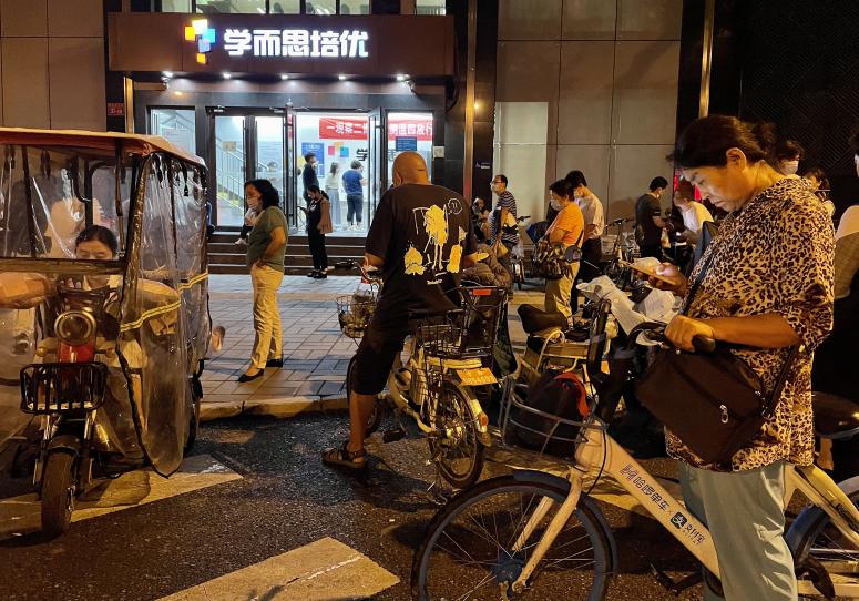 2021年9月8日,北京一家学而思辅导班门外等待接孩子的家长们。