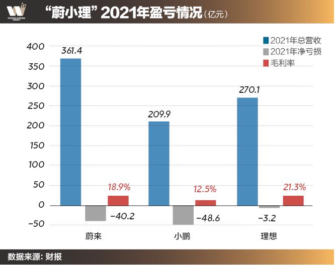 2021年,小鹏的净亏损达到48.63亿元,同比扩大30%;蔚来亏损了40.16亿元,同比收窄24%;理想亏损为3.22亿元,同比扩大幅度达到112%。