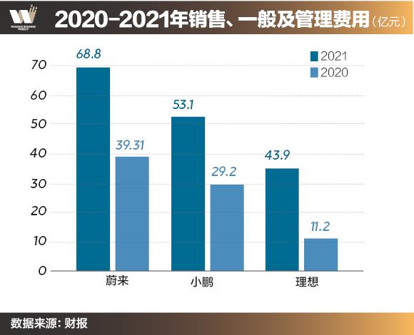 2021年,三家企业的销售/管理费用增幅均超过70%,其中理想最为“凶猛”,幅度直接翻了2倍。