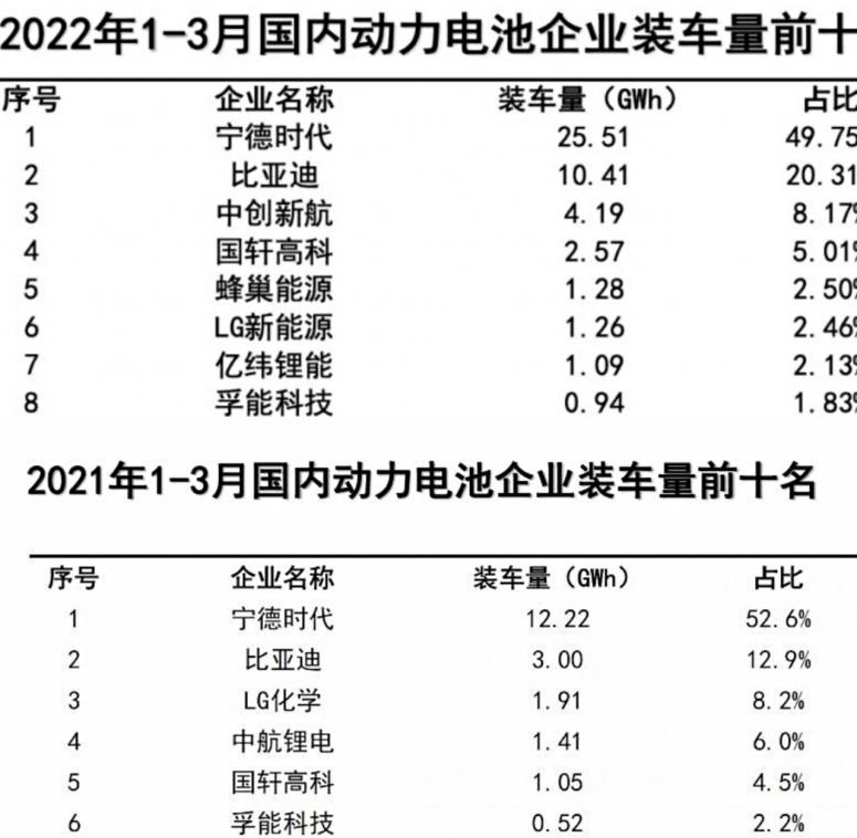 中国汽车动力电池产业创新联盟数据显示,2022年第一季度,宁德时代动力电池装车量装机量 25.5GWh,同比保持翻倍式增长,但市占率有所下滑,为49.75%,已经跌破50%。
