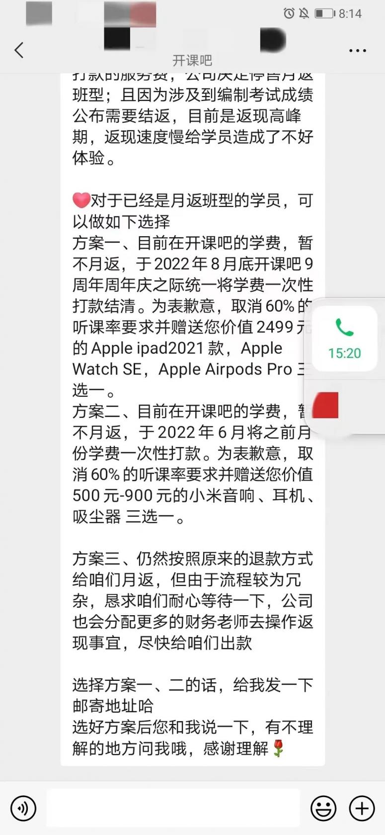 等到的是新的通知。多次催促后,班主任在5月5日告知,公司决定停售月返班型,对已缴费学员推出新的活动,停止月返,学员可选择8月底一次性结清或6月底返还之前月份的学费,公司会提供相应礼品。如坚持月返 ,仍需“耐心等待”,理由是“流程较为冗杂”。