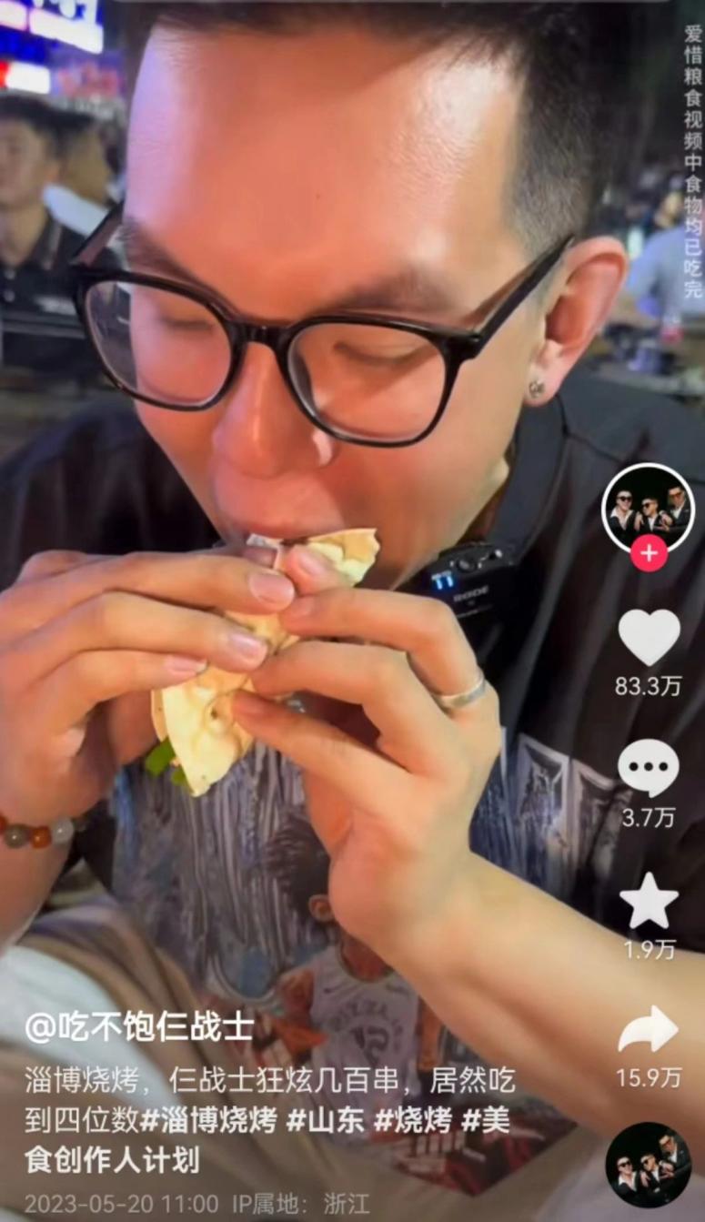 最先嗅到流量的是美食博主,691万粉丝的“小甲同学”、803万粉丝的“吃不饱仨战士”、1623万粉丝的“特别乌啦啦”等人都顺着香味赶到了淄博,拍的相关视频点赞量都超过了40万。