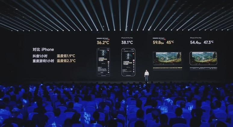 他举例称,对比iPhone14 Pro Max,小米MIX Fold 3刷抖音1小时,温度低1.9度;玩重度游戏1小时,温度还要低2.3度。