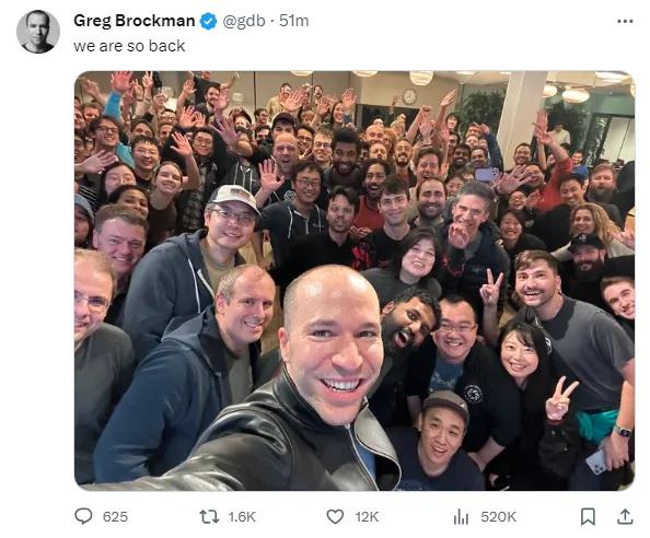 集体罢工显然是有效的,最后,闹剧以奥特曼回归“暂时”告一段落。布罗克曼也在社交平台晒出众多员工的照片,并配文“我们回来了”。