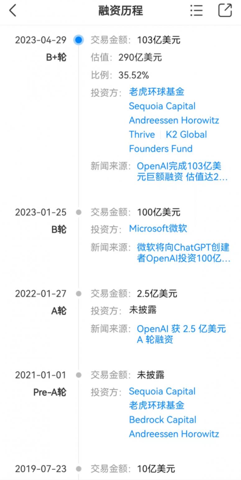 在奥特曼的计划下,OpenAI的日子一点点变好。A轮、B轮、B+轮,2.5亿美元、100亿美元、103亿美元,奥特曼拉来的钱越来越多。