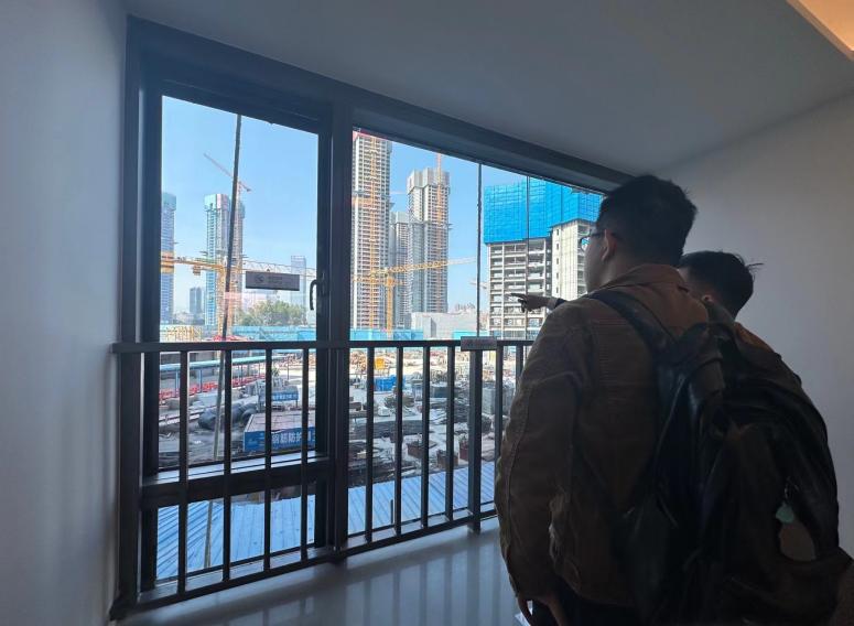 12月2日的中洲迎玺样板房内,看房者透过窗户观察超核中心润府、中海珑悦理两楼盘 图/杨依依