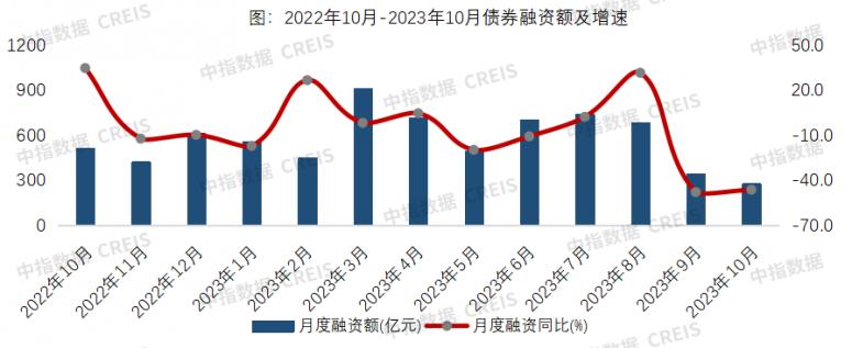 中指院数据显示,2023年1-10月,房地产企业债券融资总额为5875.1亿元,同比下降8.9%,其中,信用债融资3648亿元,同比降9.2%。