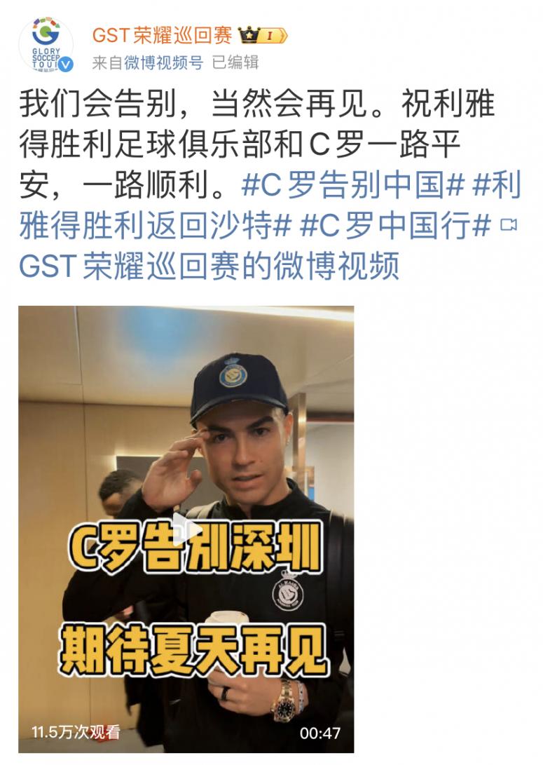 1月26日,GST荣耀巡回赛官方发布视频,C罗以及利雅得胜利全队离开深圳。