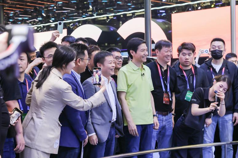 或是因为第一次参展,也或是因为身为北京企业,有着“本土优势”,雷军在自家小米汽车展台吸够了流量之后,便化身为行走的“流量包”。