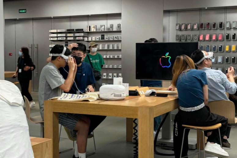 首发当日,《凤凰WEEKLY财经》依据预约好的时间到访Apple西单大悦城店,发现店内已经有几组顾客头戴Vision Pro在进行体验,他们时不时举起手指在空中点击、触动,场面颇具科技感。