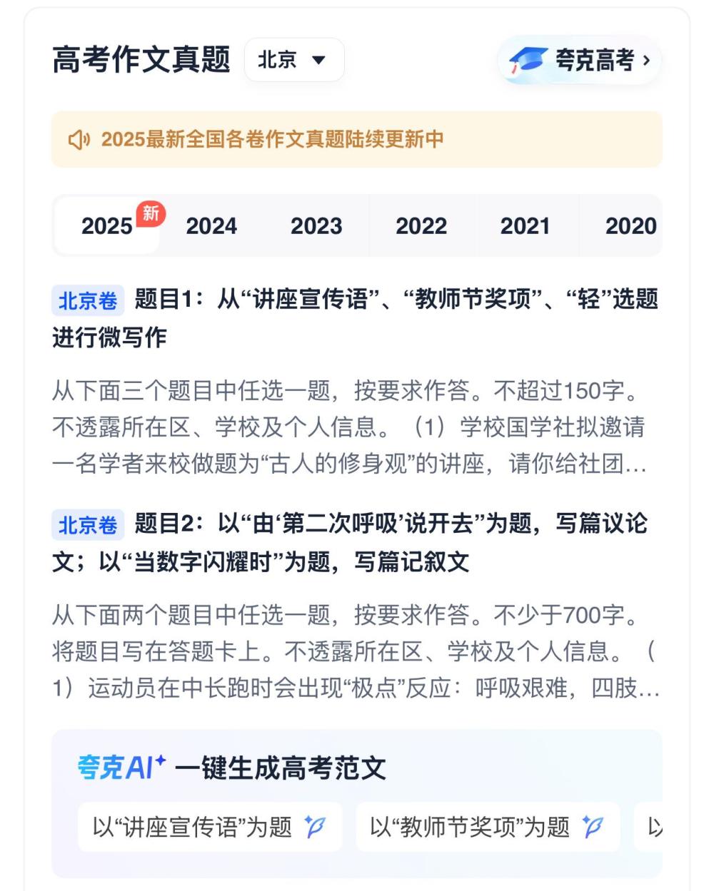 目前,考生和家长可以在夸克使用“AI写作”功能或者直接搜索“高考作文”即可体验各类写作素材及文章。针对考后志愿填报难题,夸克还提供了智能选志愿、志愿表、高考深度搜索等功能。