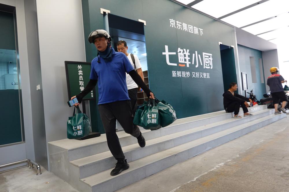 2025年7月23日,北京,京东外卖店“七鲜小厨”外,外卖员准备为顾客送餐。