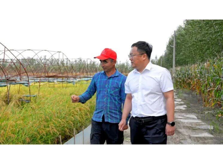 农行辽宁盘锦分行工作人员和当地农户察看稻田蟹长势情况