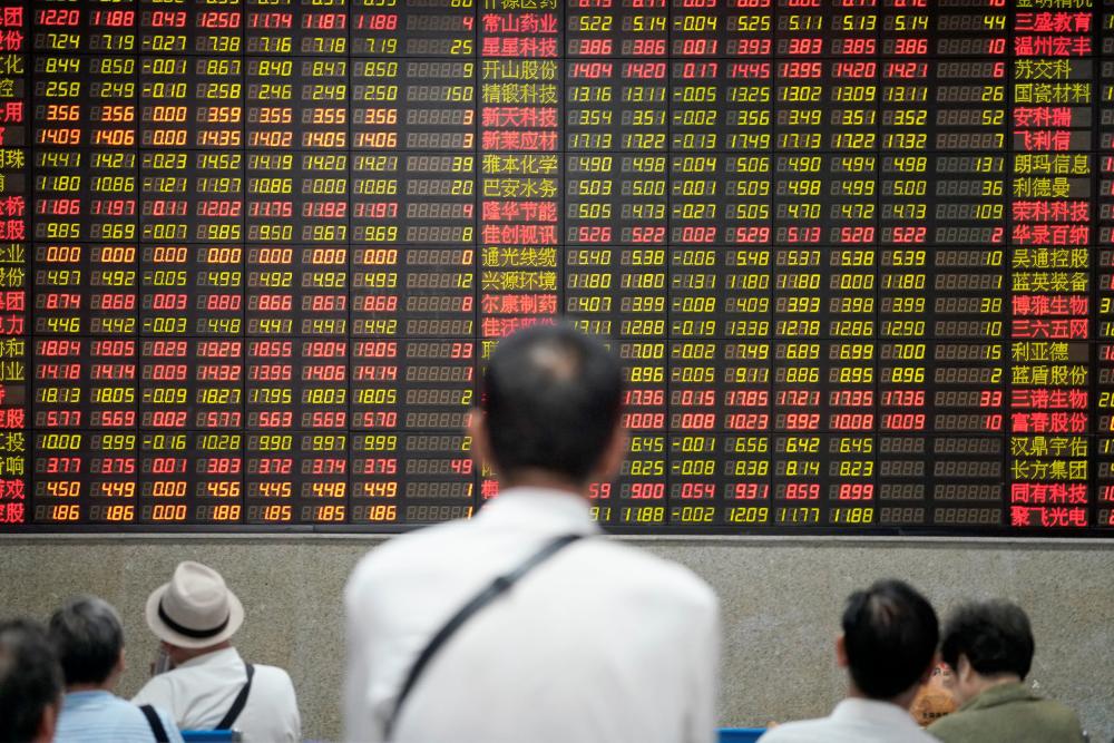2024年9月27日,上海一座人行天桥下,屏幕上显示当日沪市和深市股票指数。