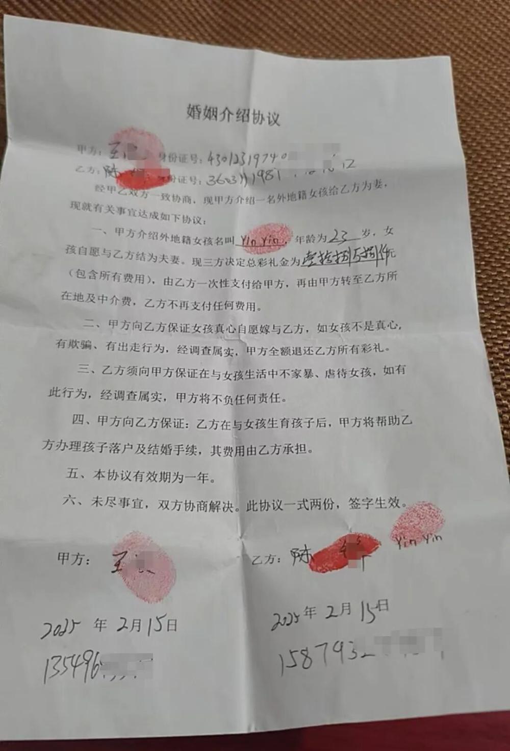 最终,陈江选中了23岁、代号“yin yin”的女孩,并支付了18.8万元现金。作为乙方,他在一份《婚姻介绍协议》上签了字。协议有效期一年,其中明确规定:甲方向乙方保证女孩真心自愿嫁予乙方,若女孩非真心实意、存在欺骗行为或擅自出走,经核实后,甲方需全额退还所有彩礼;待乙方与女孩生育子女后,甲方将协助办理孩子落户及双方结婚登记手续。签约日期为当天,2025年2月15日。