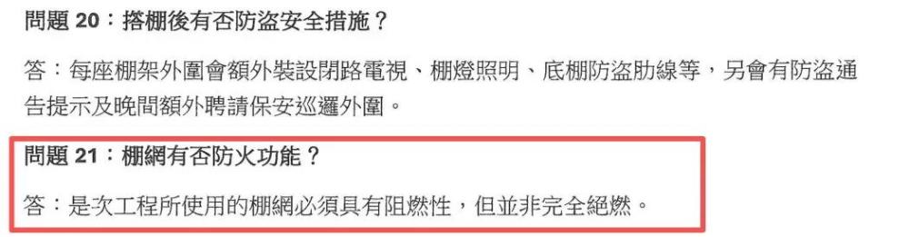 而在宏福苑大维护工程前的一份答疑文件中,施工方曾承诺,此次工程所使用的棚网“必须具有阻燃性,但并非完全绝燃”。