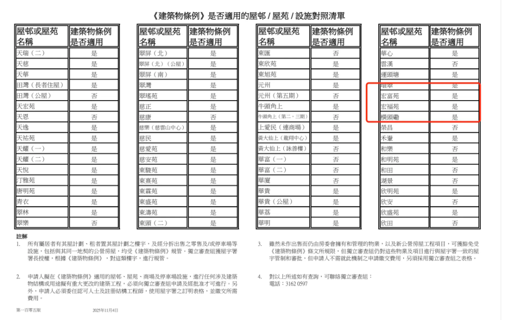 港府屋宇署官网,宏福苑被列入强制验楼验窗计划范围。
