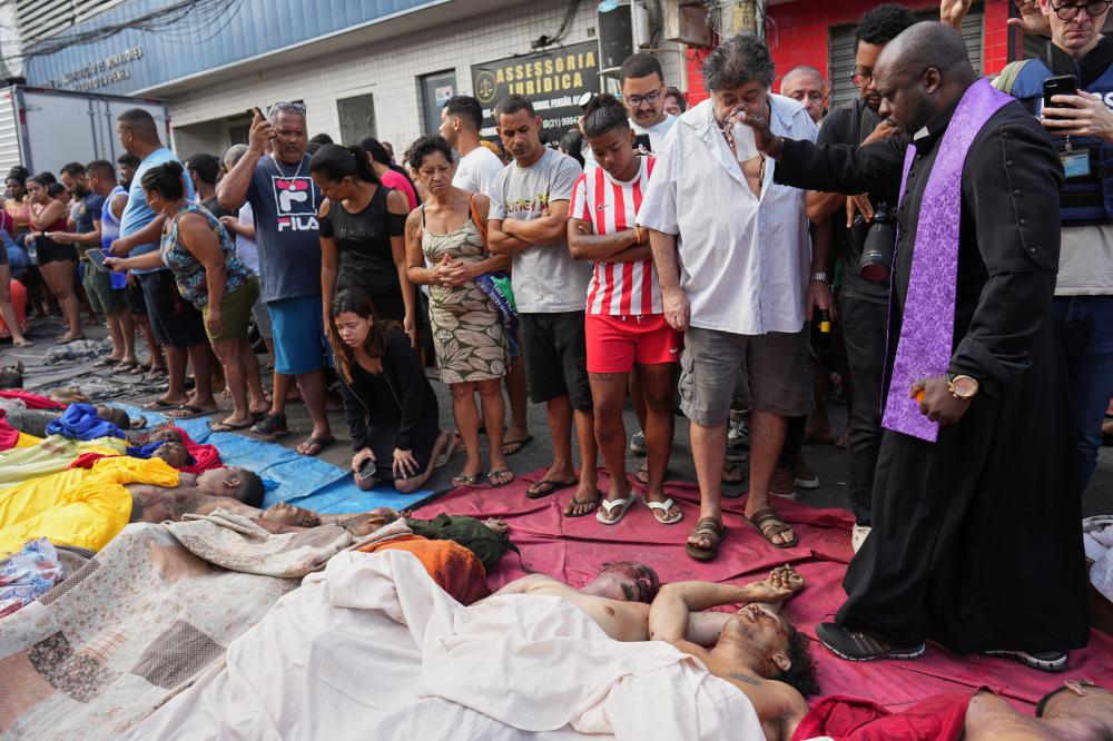 据法新社报道,10月29日,里约热内卢一个社区的居民在街上将死者排成一排。巴西最血腥的一次警察突袭造成至少119人死亡,令该市打击盘踞在贫困社区的贩毒团伙“红色司令部”的有争议战争备受关注。