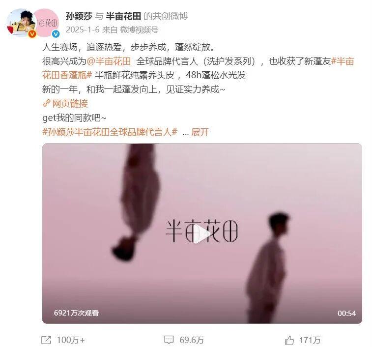 这一年,半亩花田签约奥运冠军孙颖莎出任洗护发系列全球代言人。彼时孙颖莎微博宣布这一消息,获得69.5万条评论,170万个点赞,影响力可见一斑。