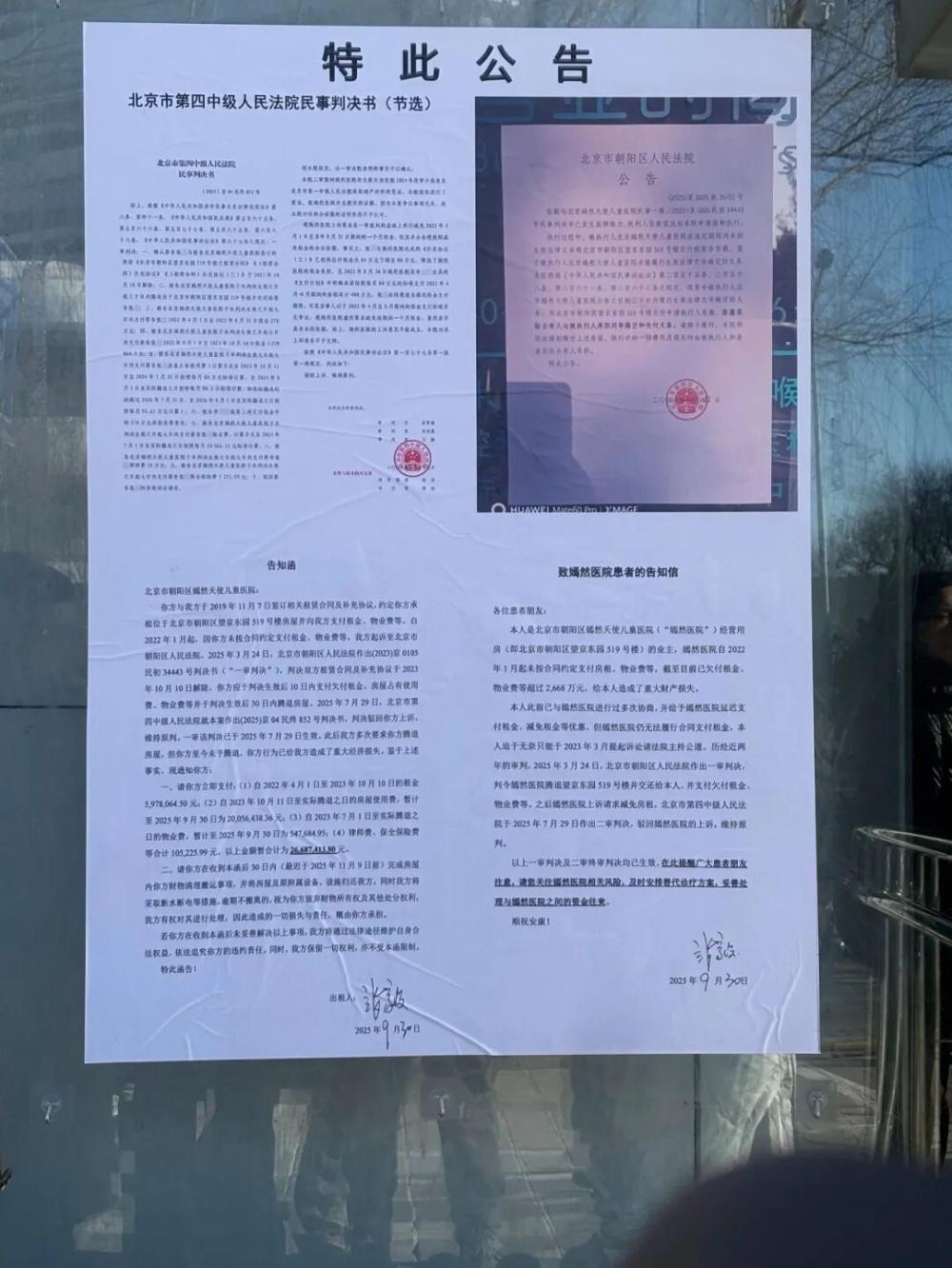 玻璃门上贴着房东致患者的告知信,称嫣然医院自2022年1月起未按合同约定支付房租、物业费等,截至2025年9月30日,欠款已超2668万元,给其造成严重损失。并列贴着的,还有法院2025年11月4日发布的强制执行书,要求医院在30日内履行生效法律文书确定的义务,即腾退并交付北京市朝阳区望京东园519号楼。