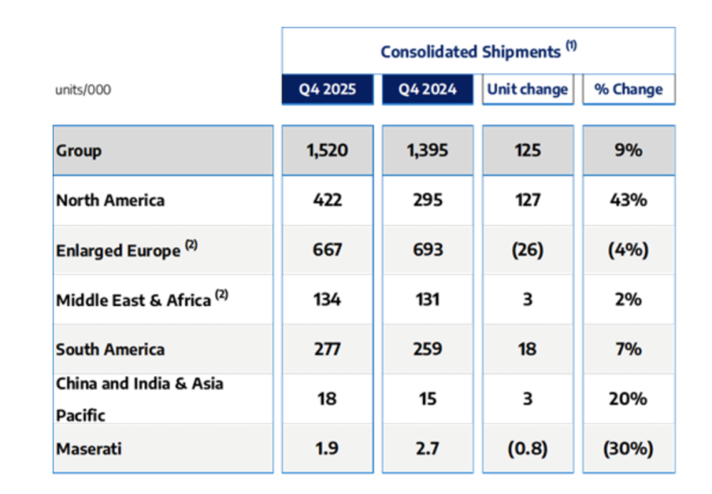 2025年第四季度,Stellantis在全球各地交付量(图/财报截图)