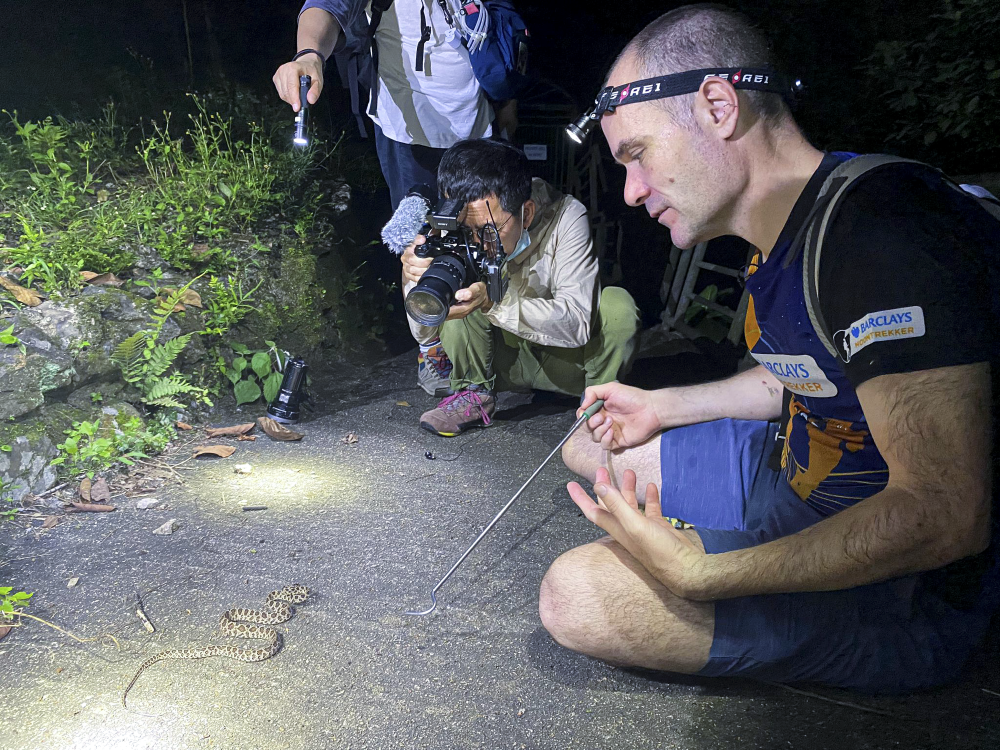 2023年,《香港自然故事》拍摄现场,蛇王William欲将小蛇送回山林。