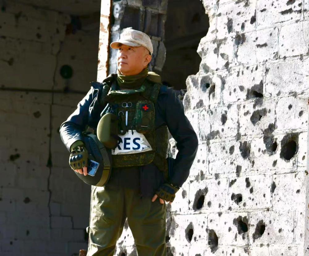 2023年5月,乌克兰东部巴赫穆特。战事进入最惨烈阶段,俄乌双方在这座几乎被夷为废墟的城市中进行消耗战。卢宇光在现场采访后,站在布满弹孔的建筑残骸旁。