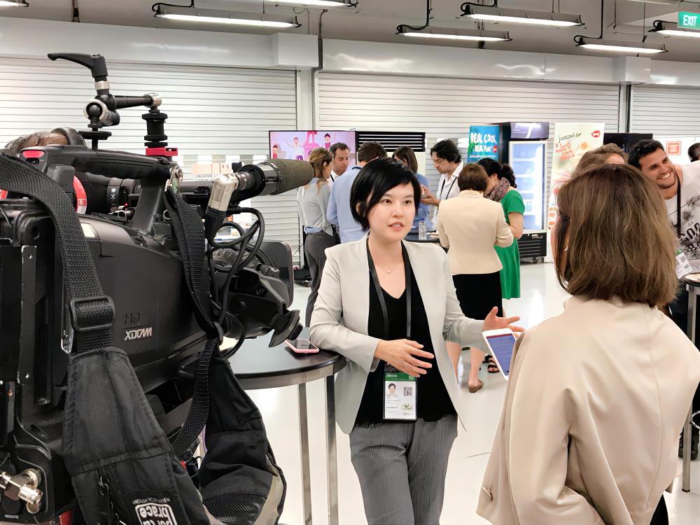 2018年6月,新加坡,《凤凰周刊》国际报道总监漆菲在“特朗普与金正恩会晤”的媒体中心接受新加坡媒体采访。